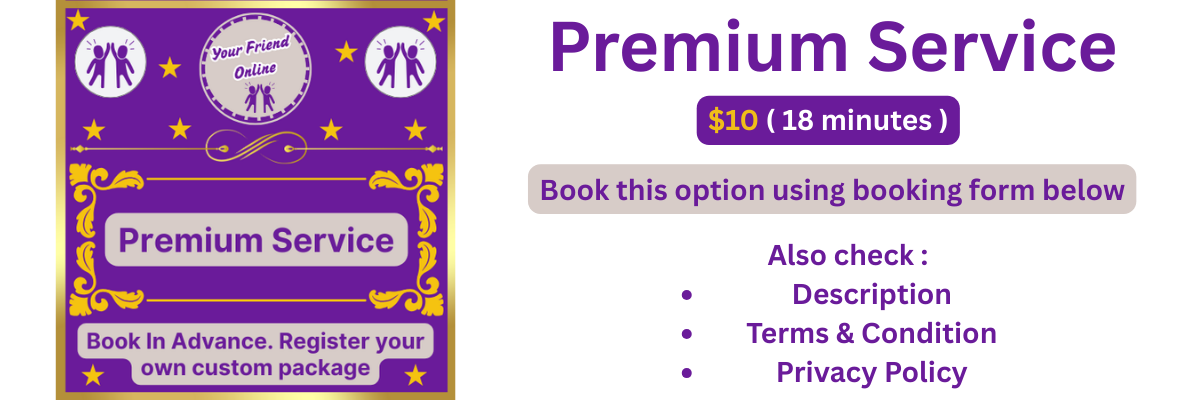 I want monthly , quarterly or yearly package. I do not want to book daily or wait for slot to be available. I want to do calls at my decided time even that is not in your working slot. I do not want fix time. I want to do call whenever I want. Like you are just one call or message away. Watch this Netflix series complete and discuss with me. Or read this book complete or etc. Talk this or discuss this with my family member or friend or any belonging person. Assist me in any business, project, academic things, or any other task, etc. Send me this thing or gift from your country. Or need local seller or any local contact, etc. Any other reasonable demand can be discussed. Please note : Premium call option is just 18 minutes call to discuss only the custom package and things. Not for regular discussions like Casual Friend, Science & Technology, Career Guidance, Business Related, Life Coach, Relationships Related, Mental Health Support, Comparative Religion, Paranormal Discussions. And you will be able to update things later, if you want. Please note : If you want to discuss the premium custom things and services in your regular hourly can then you not need to buy premium service option separately.Terms & Conditions